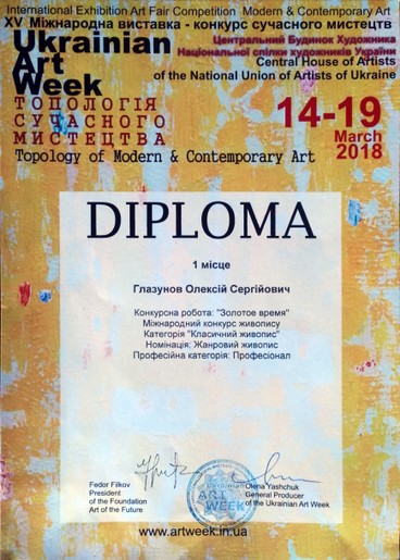2018 г. - присуждено 1е место за картину «Золотое время» (номинация жанровая картина) в рамках XVI Международной выставки-конкурс "Украинская неделя искусств"/Ukrainian Art Week.